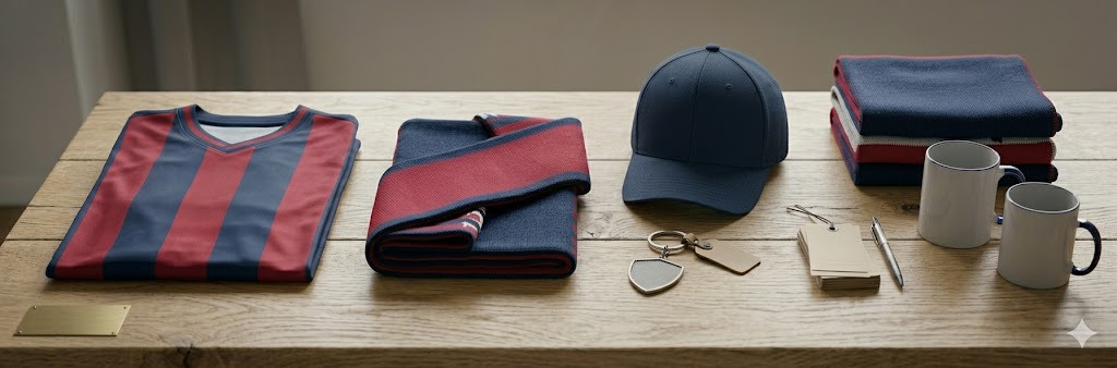 - Die Vereins-Basics (Trikot, Trainingsshirt, Schal).
