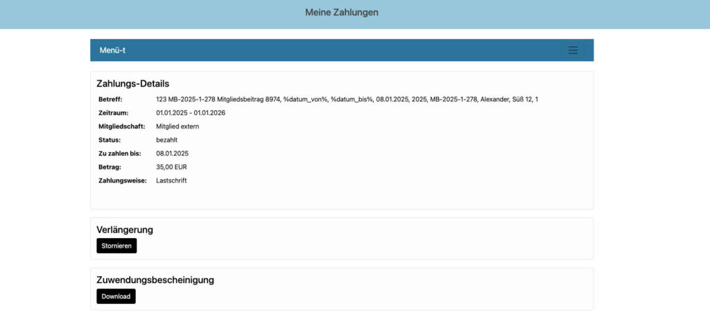 Manuell erstellen können Sie die Zuwendungsbescheinigung unter Mitgliedsbeiträge, wenn Sie auf „Bearbeiten“ klicken. Hier finden Sie nun unten den Bereich „Zuwendungsbescheinigung“. Klicken Sie hier aus den Button „pdf erzeugen“, nun wird die Zuwendungsbescheinigung erstellt. Über den Link „Download“ können Sie das Dokument herunterladen.
