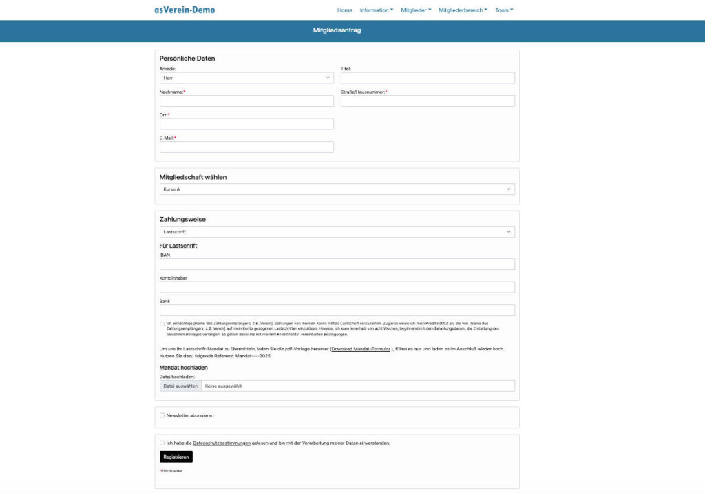 Im mehrstufigen Antragsformular, welches sowohl für den Antragsmodus oder die Registrierung genutzt werden kann, erfolgt der Mitgliedsantrag in mehreren Schritten: Persönliche Daten, Zahlungsinformation und Lastschrift-Mandat.